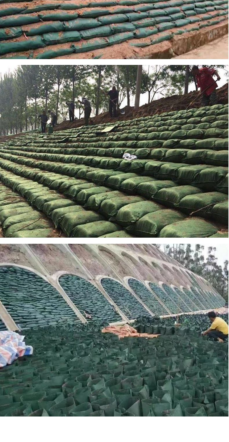 生态袋是一种环保、无污染型的工农业用袋子,袋体是由绿色聚丙烯(PP)或者绿色聚酯纤维(PET)为原材料制成的双面熨烫针刺无纺布加工而成的袋子。土工布袋具有抗紫外线、抗老化、无毒,不助燃,裂口不延伸的特点,真正实现了零污染。生态袋主要运用于建造柔性生态边坡。生态袋边坡防护绿化,是荒山、矿山修复、高速公路边坡绿化、河岸护坡,内河整治中重要的施工方法之一常规护坡使用之外,在其他工程中使用也是比较广泛,比如土工膜施工中的压重工序,就是在生态袋中装入沙土用来压重,生态袋的用途广泛,其主要原因除了袋体自身条件外,还有就是可二次利用,生态袋具有抗潮湿性,不吸水,水分不会破坏袋子,袋子也不会变形,不溶于污染液体,是一种保护生态的好工具 很实用。