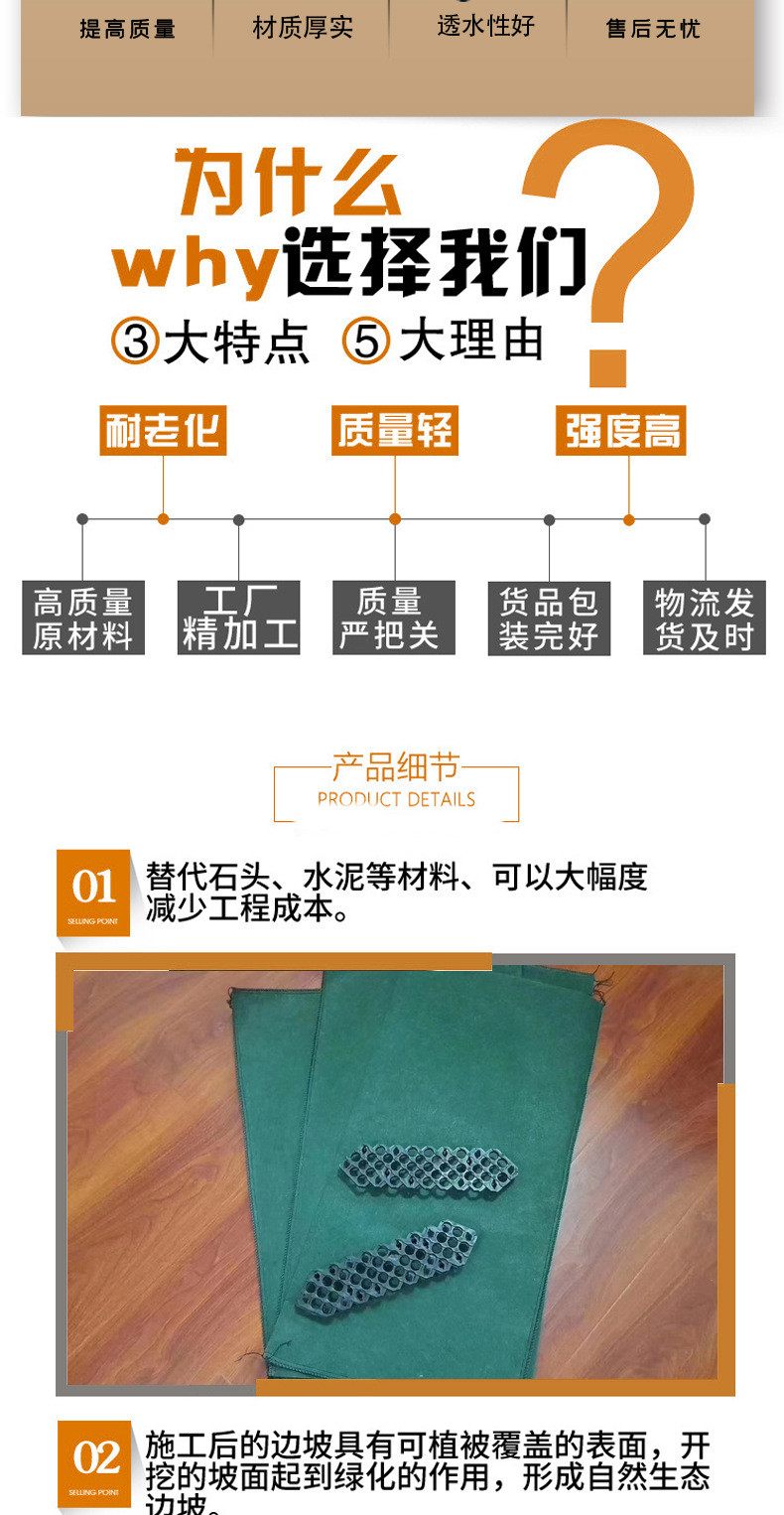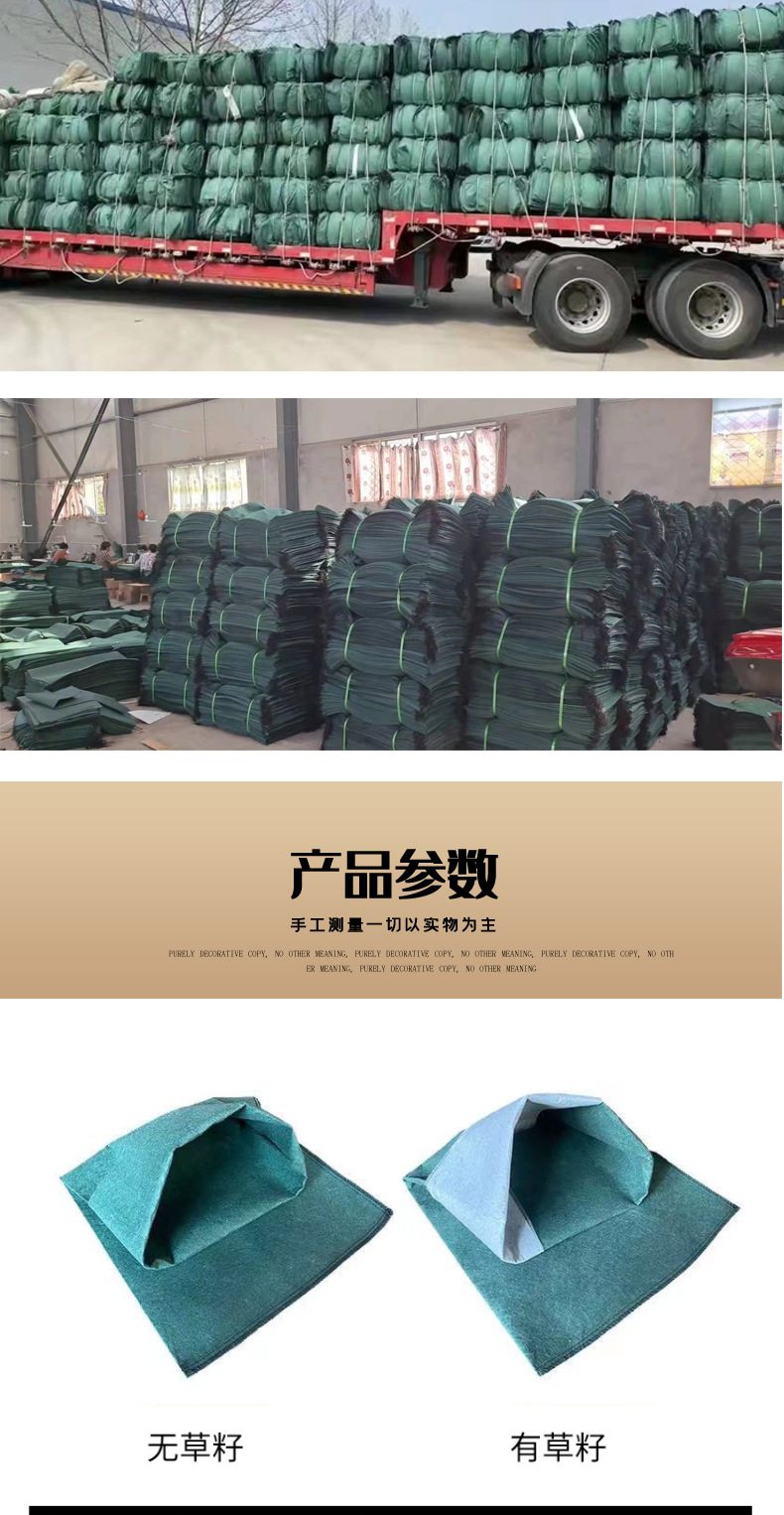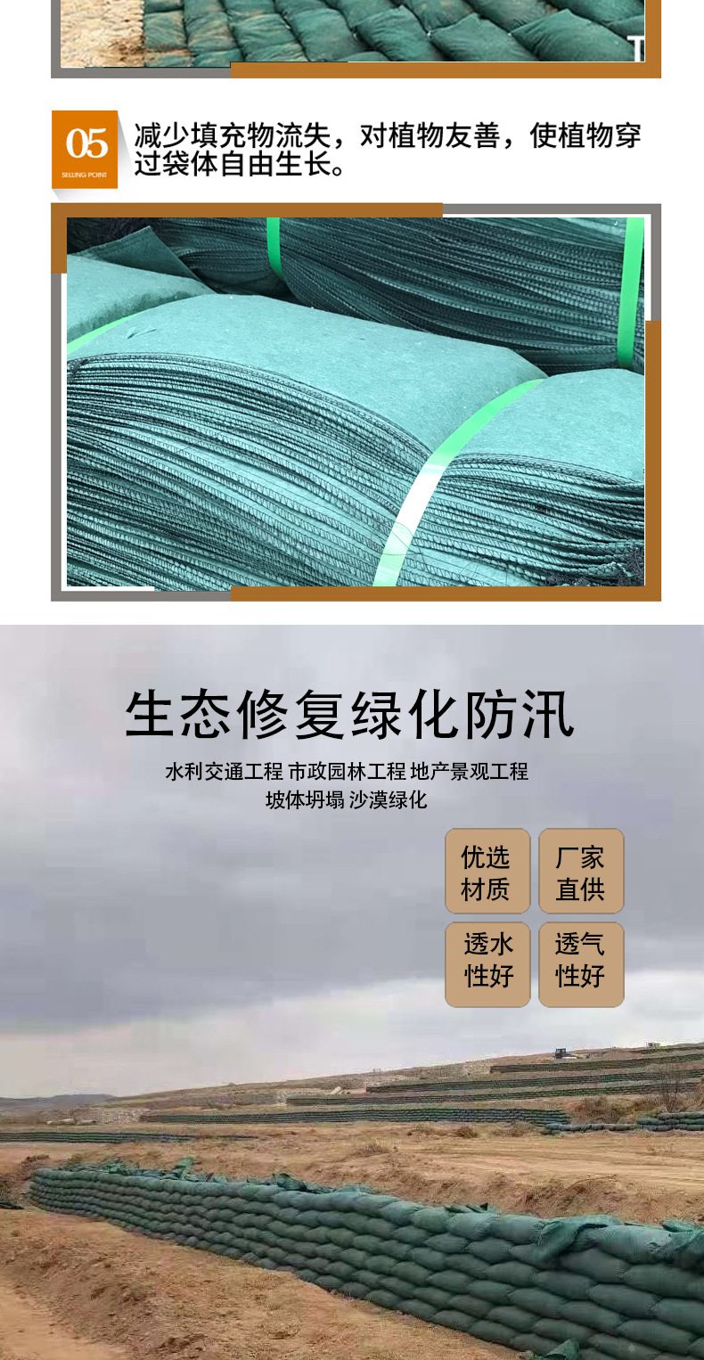 生态袋是一种环保、无污染型的工农业用袋子,袋体是由绿色聚丙烯(PP)或者绿色聚酯纤维(PET)为原材料制成的双面熨烫针刺无纺布加工而成的袋子。土工布袋具有抗紫外线、抗老化、无毒,不助燃,裂口不延伸的特点,真正实现了零污染。生态袋主要运用于建造柔性生态边坡。生态袋边坡防护绿化,是荒山、矿山修复、高速公路边坡绿化、河岸护坡,内河整治中重要的施工方法之一常规护坡使用之外,在其他工程中使用也是比较广泛,比如土工膜施工中的压重工序,就是在生态袋中装入沙土用来压重,生态袋的用途广泛,其主要原因除了袋体自身条件外,还有就是可二次利用,生态袋具有抗潮湿性,不吸水,水分不会破坏袋子,袋子也不会变形,不溶于污染液体,是一种保护生态的好工具 很实用。
